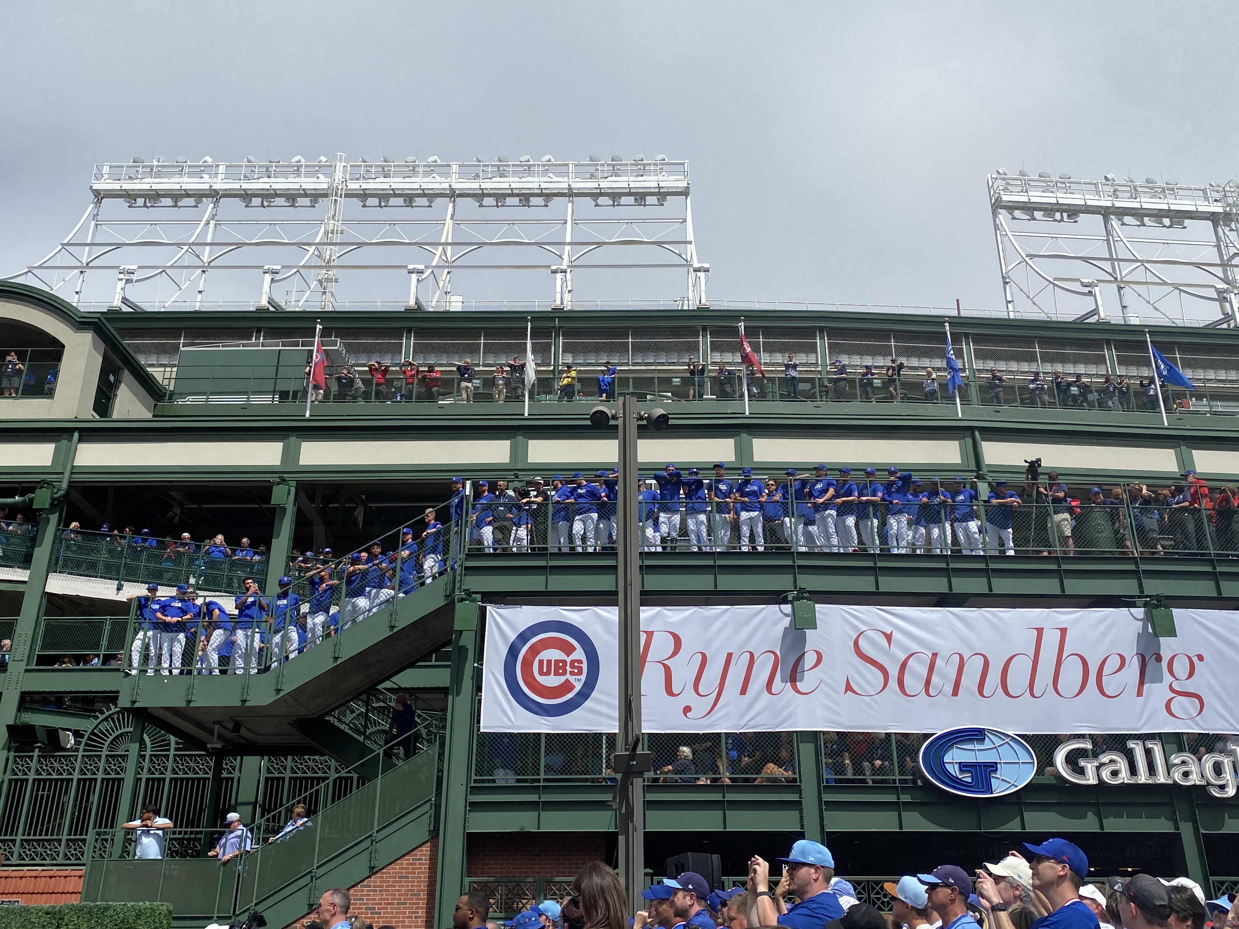 "On June 23, the 40th anniversary of The Ryne Sandberg Game, the Cubs unveiled a statue of the Hall of Fame second baseman. As Sandberg addressed a crowd that filled Gallagher Way and stretched down Clark Street, the 2024 Cubs team headed up Wrigley’s ramps to watch from above. I snapped this photo, because it was striking to see the players, in uniform, standing like fans in the ballpark, away from the field."