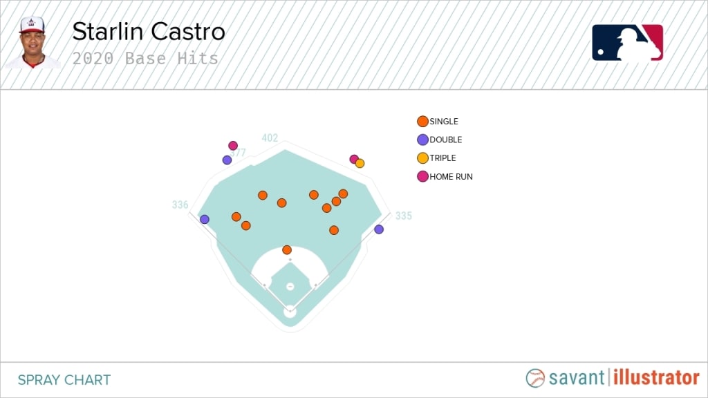 \n","providerName":"Twitter","providerUrl":"https://twitter.com","thumbnail_url":null,"type":"oembed","width":550,"contentType":"rich"},{"__typename":"Markdown","content":"Castro is showing a preview of the depth that he can bring back to the Nats’ offense this season. At the start of Spring Training, he said, “Wherever they put me, I’m going to do my job.”\n\nCastro gives Martinez the option for a reliable bat in the middle of the order, where he could add to the power of Juan Soto, Trea Turner, Bell and Kyle Schwarber.\n\n“He's a guy that we feel -- he's going to hit in the middle of our lineup \\[and\\] could do some damage for us,” Martinez said. “And I'm not just talking about hitting home runs, I'm talking about spraying the baseball everywhere and driving in some key runs for us.\"\n\nThis Statcast chart of Castro’s 2020 offensive performance paints the picture:","type":"text"},{"__typename":"Image","caption":null,"contextualCaption":null,"contextualAspectRatio":"16:9","credit":null,"contentType":"Photography","format":"jpg","templateUrl":"https://img.mlbstatic.com/mlb-images/image/private/{formatInstructions}/mlb/a2wvueluuauwopxaacgj","type":"image"},{"__typename":"Markdown","content":"“We don’t want to take away his aggressiveness at the plate,” Martinez said. “One thing about Starlin, if you look at him, he could hit bad balls and put balls in play -- and he does it. I’ve seen him hit balls almost on the ground for base hits. We don’t ever want to take that away from him. We want him to always be aggressive.”\n\nBefore his injury, Castro batted .267 over 16 games last season. Over his 11-year career, he has a slash line of .280/.319/.414. The four-time All-Star has accumulated 1,633 hits, and he is one year removed from playing all 162 regular-season games in 2019 with the Marlins.\n\n“He’s a guy that I never worry about,” Martinez said. “I write his name in the lineup because he loves to play the game of baseball.”","type":"text"}],"relativeSiteUrl":"/news/starlin-castro-enjoys-strong-spring-camp","contentType":"news","subHeadline":"Veteran's offensive track record makes him stalwart for Nats' lineup","summary":"WEST PALM BEACH, Fla. -- It wasn’t long after Starlin Castro underwent surgery for a broken right wrist last season that he expressed his desire to return to the field.\nCastro’s first season with the Nationals was cut short on Aug. 13. He told manager Dave Martinez that he wanted","tagline({\"formatString\":\"none\"})":null,"tags":[{"__typename":"InternalTag","slug":"storytype-article","title":"Article","type":"article"},{"__typename":"ContributorTag","slug":"jessica-camerato","title":"Jessica Camerato","type":"contributor"},{"__typename":"GameTag","gamePk":642042,"slug":"gamepk-642042","title":"2021/03/16 mia@was","type":"game"},{"__typename":"PersonTag","slug":"playerid-516770","title":"Starlin Castro","person":{"__ref":"Person:516770"},"type":"player"},{"__typename":"TeamTag","slug":"teamid-120","type":"team","title":"Washington Nationals","team":{"__ref":"Team:120"}},{"__typename":"TaxonomyTag","slug":"spring-training","title":"Spring Training","type":"taxonomy"}],"type":"story","thumbnail":"https://img.mlbstatic.com/mlb-images/image/private/{formatInstructions}/v1616179527/mlb/gbr7vsef3t4xqvysbfru","title":"Starlin Castro enjoys strong spring camp"},"getTeamsBySportId({\"ids\":[1]})":[{"__ref":"Team:133"},{"__ref":"Team:134"},{"__ref":"Team:135"},{"__ref":"Team:136"},{"__ref":"Team:137"},{"__ref":"Team:138"},{"__ref":"Team:139"},{"__ref":"Team:140"},{"__ref":"Team:141"},{"__ref":"Team:142"},{"__ref":"Team:143"},{"__ref":"Team:144"},{"__ref":"Team:145"},{"__ref":"Team:146"},{"__ref":"Team:147"},{"__ref":"Team:158"},{"__ref":"Team:108"},{"__ref":"Team:109"},{"__ref":"Team:110"},{"__ref":"Team:111"},{"__ref":"Team:112"},{"__ref":"Team:113"},{"__ref":"Team:114"},{"__ref":"Team:115"},{"__ref":"Team:116"},{"__ref":"Team:117"},{"__ref":"Team:118"},{"__ref":"Team:119"},{"__ref":"Team:120"},{"__ref":"Team:121"}],"getHeaderFromForgePath({\"contentSource\":\"MLB\",\"headerPath\":\"/_navs/header/wsh/global-nav\",\"locale\":\"en-US\",\"paletteKey\":\"t120-base-palette\",\"propertiesKey\":\"t120-global-properties\"})":{"__typename":"Header","navigation":[{"__typename":"NavItem","customPropertiesString":"mobile:true;","icon":null,"linkTarget":null,"linkText":"Tickets","linkUrl":"/tickets","placement":"mobile","visible":null,"subNav":[{"__typename":"SubnavColumn","title":null,"navigation":[{"__typename":"NavItem","placement":null,"linkText":"Nats TicketFinder: Find the Best Ticket Option for You!","linkUrl":"/tickets/ticket-finder","linkTarget":null,"visible":null,"icon":null,"tooltip":null,"customPropertiesString":null},{"__typename":"NavItem","placement":null,"linkText":"2026 Ticket Plans","linkUrl":"/tickets/season-tickets/plan-options","linkTarget":null,"visible":"true","icon":null,"tooltip":null,"customPropertiesString":null},{"__typename":"NavItem","placement":null,"linkText":"2026 Group Tickets","linkUrl":"/tickets/group-tickets","linkTarget":null,"visible":"true","icon":null,"tooltip":null,"customPropertiesString":null},{"__typename":"NavItem","placement":null,"linkText":"2026 Suites & Premium Seating","linkUrl":"/tickets/premium","linkTarget":null,"visible":null,"icon":null,"tooltip":null,"customPropertiesString":null},{"__typename":"NavItem","placement":null,"linkText":"* Holiday Packs - 3 Games + City Connect Beanie *","linkUrl":"/tickets/packs/holiday","linkTarget":null,"visible":"true","icon":null,"tooltip":null,"customPropertiesString":null},{"__typename":"NavItem","placement":null,"linkText":"* Winter Wonderfest - November 28-December 30 *","linkUrl":"/tickets/winterfest","linkTarget":null,"visible":null,"icon":null,"tooltip":null,"customPropertiesString":null},{"__typename":"NavItem","placement":null,"linkText":"Current Season Plan Holders - RENEW FOR 2026!","linkUrl":"/tickets/season-tickets","linkTarget":null,"visible