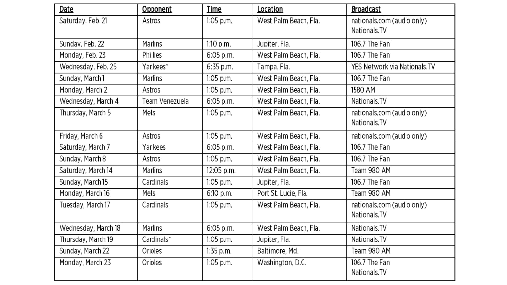 The Nationals open their Grapefruit League schedule on Saturday, Feb. 21, with split-squad matchups at home against the Houston Astros and at Roger Dean Stadium in Jupiter against the St. Louis Cardinals. Fans can catch the Nationals-Astros game on Nationals.TV or on radio via Nationals.com.