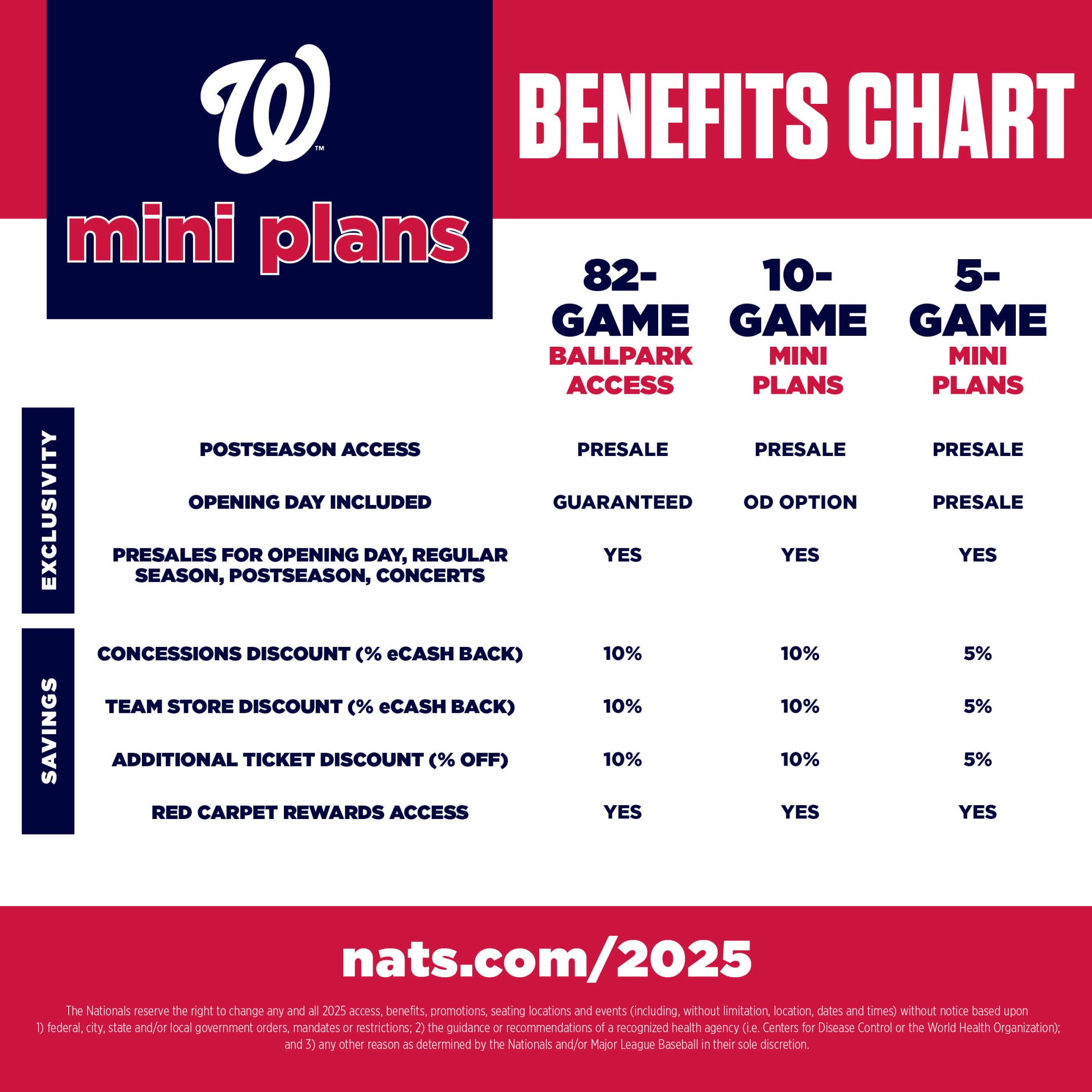 The Nationals reserve the right to change any and all 2026 access, benefits, promotions, seating locations and events (including, without limitation, location, dates and times) without notice based upon: 1) federal, city, state and/or local government orders, mandates or restrictions; and 2) other reason as determined by the Nationals and/or Major League Baseball in their sole discretions.
