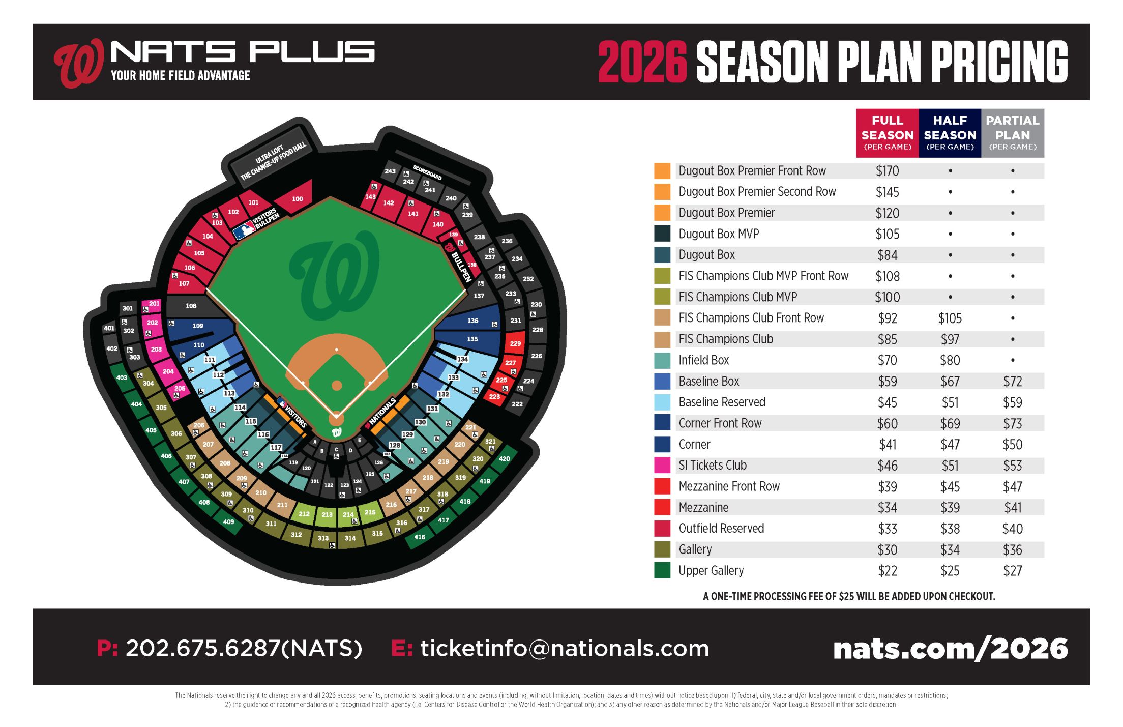 The Nationals reserve the right to change any and all 2026 access, benefits, promotions, seating locations and events (including, without limitation, location, dates and times) without notice based upon: 1) federal, city, state and/or local government orders, mandates or restrictions; and 2) other reason as determined by the Nationals and/or Major League Baseball in their sole discretions.