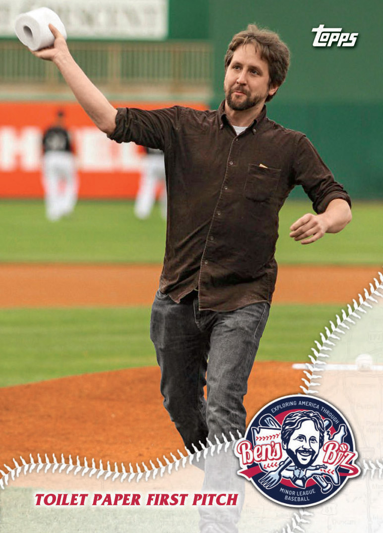 For me, visiting a ballpark means saying “yes” to just about everything. Over the years, I’ve said yes to many ridiculous things, a not inconsiderable amount of which ended in humiliation. Some were a triumph, such as my toilet paper first pitch while visiting the Wisconsin Timber Rattlers in 2013. (This was later immortalized on a Topps card, as part of the first “Ben’s Biz” insert set within their Pro Debut series).