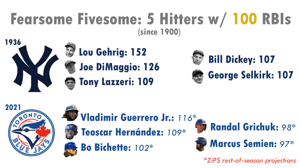 Those Blue Jays totals are courtesy of ZiPS’ adjusted projections for the rest of the year, which has Toronto’s quintet right on the cusp. History buffs will recognize four Hall of Famers out of those five Yankees (including DiMaggio in his rookie year). The ‘36 Yanks won 102 games, averaged nearly 6.9 runs per contest (third highest in AL/NL history) and outscored opponents by 334 runs (fourth most in AL/NL history). Guerrero (age 22) and Bichette (23) are off to historic starts, so maybe we’ll look back at this young Blue Jays core with Cooperstown glasses. For now, Gehrig and DiMaggio are still Gehrig and DiMaggio, and we’re not making a one-to-one comparison between those Bronx Bombers and these Blue Jays -- even if Toronto joins them with five 100-RBI guys.