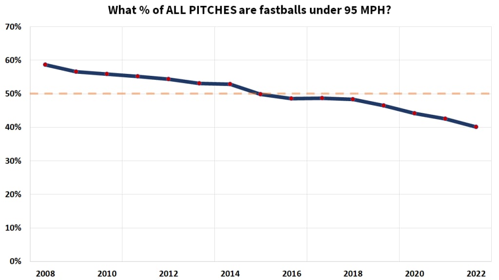 So, if you put all that together, that 60% of pitches are either “fastballs thrown real hard” or “bendy pitches with lots of movement,” that means that fastballs under 95 MLB -- i.e., the kind that hitters love to smash -- are continually on the decline.