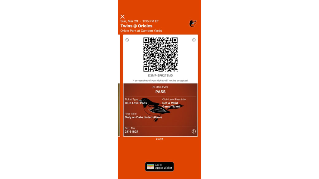 At least 3 hours before first pitch, your Club Level Pass will appear alongside your tickets in the MLB Ballpark app. It will not appear in your Birdland Rewards wallet.