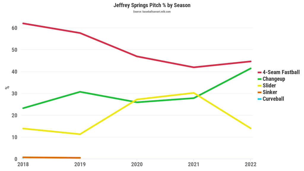 How? Springs pitched well in 2021 for the Rays before injuring his knee in August. If it looks like he’s been a new pitcher in Tampa Bay -- and he is, with a 35% strikeout rate after a mere 23% mark with Texas and Boston -- look no further than the green line here. That’s his changeup. It’s now being used about as often as his fastball.