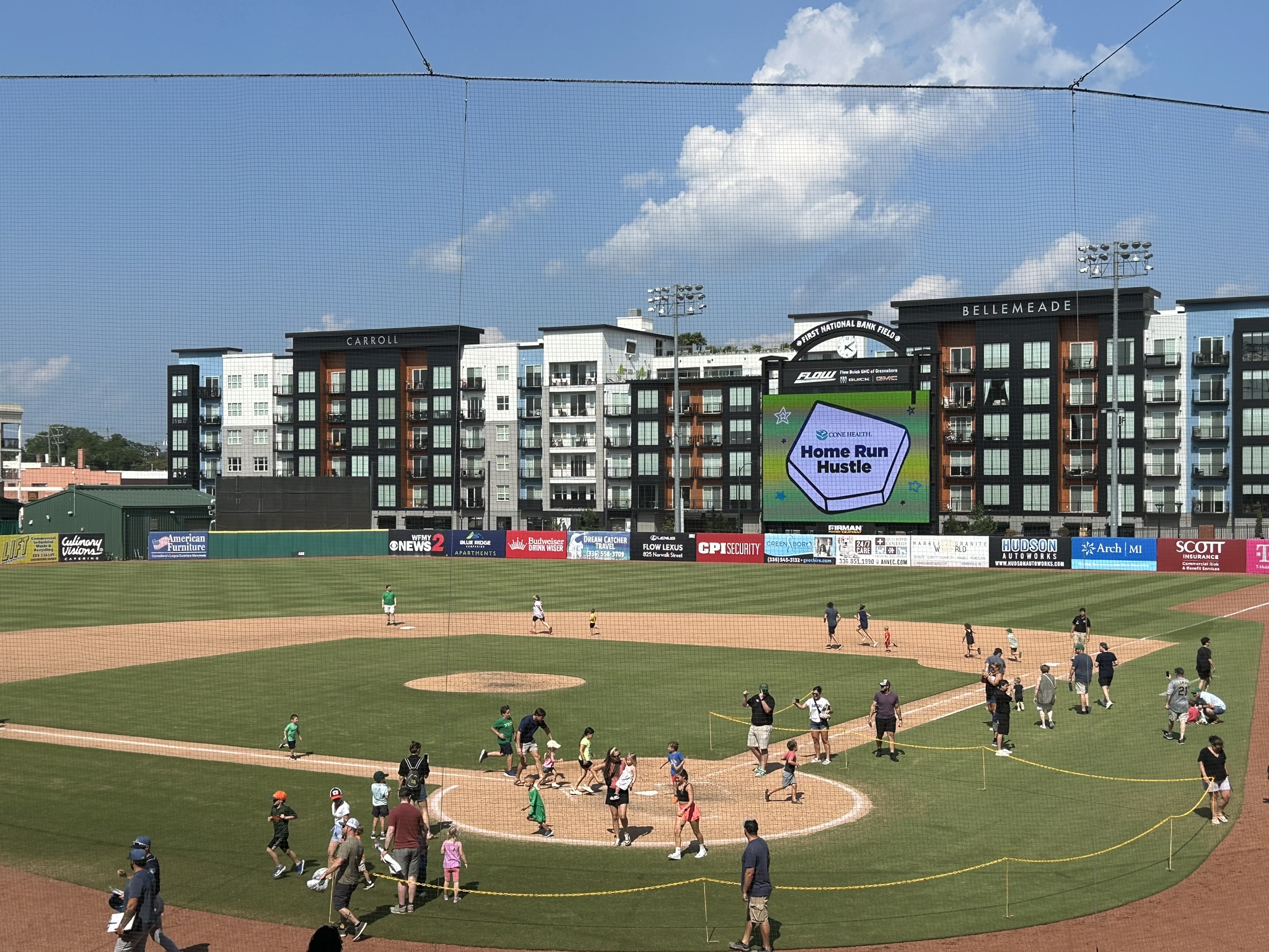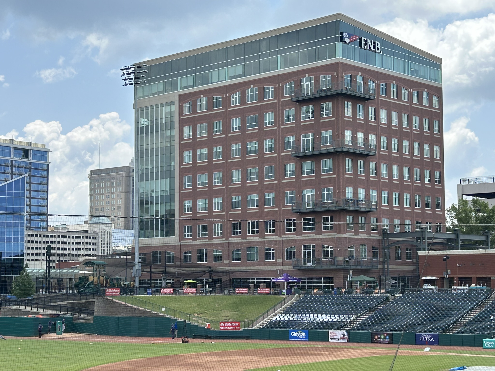The current backdrop is dominated by the Carroll at Bellemeade apartment complex, part of a project that includes the Hyatt hotel located across the street. (Carroll is the name of a real estate development firm, Bellemeade is the street that runs along the first-base side of the ballpark).