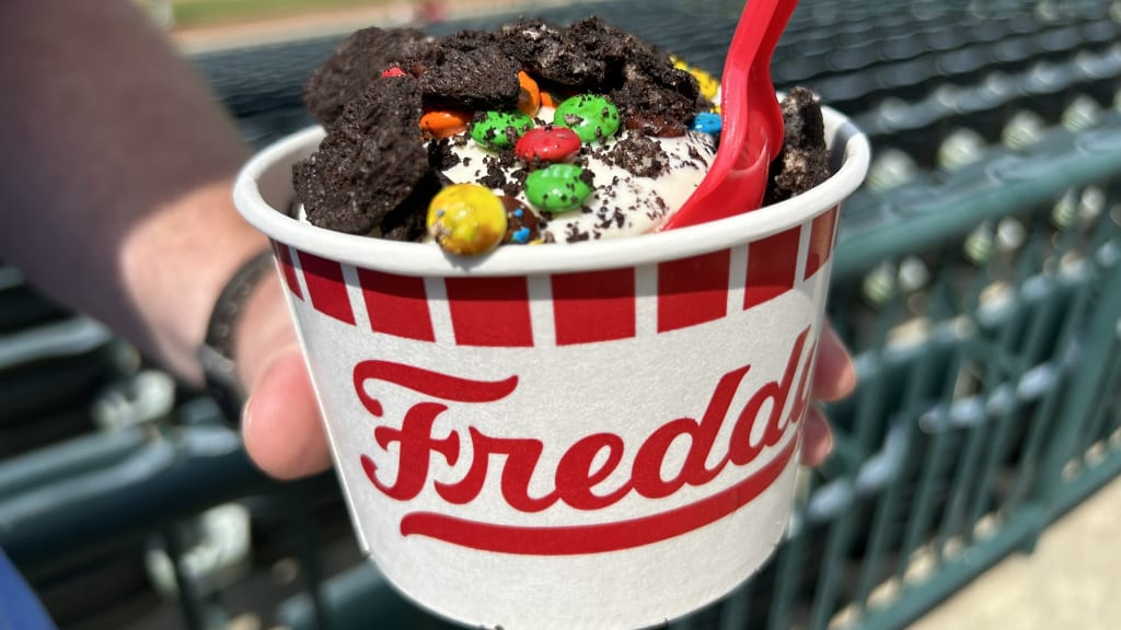 After that, more food also seemed unnecessary. But, hey, nothing wrong with a little dessert. The Hoppers have a Freddy’s Frozen Custard cart set up down the first-base line, so we paid a visit.