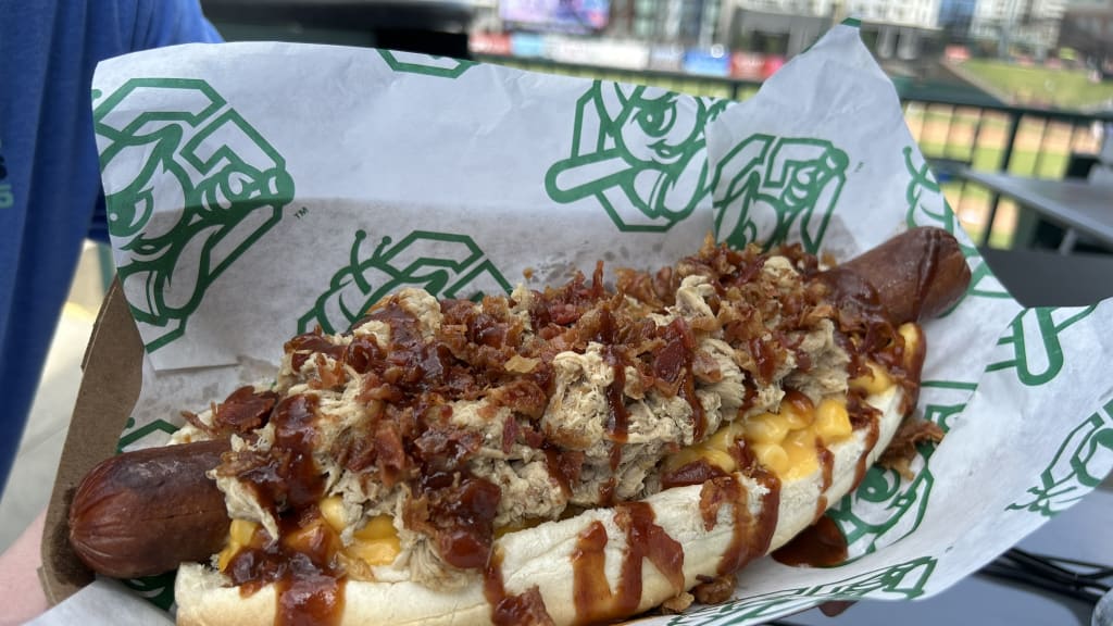 The Connie Mack Attack is a footlong hot dog topped with mac(k) and cheese, pulled pork, bacon bits and barbecue sauce.