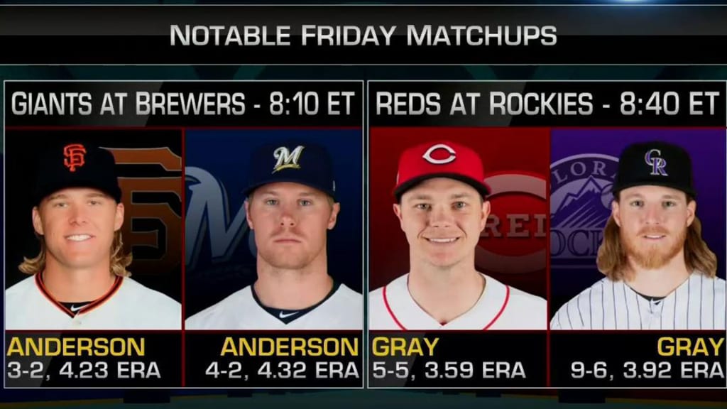 Friday’s series opener in Milwaukee will see the Brewers’ Chase Anderson take on Giants starter Shaun Anderson at 8:10 p.m. ET. A half hour later in Denver, Colorado’s Jon Gray takes on Cincinnati’s Sonny Gray. Anderson vs. Anderson … and Gray vs. Gray. Yes, it’s weird.