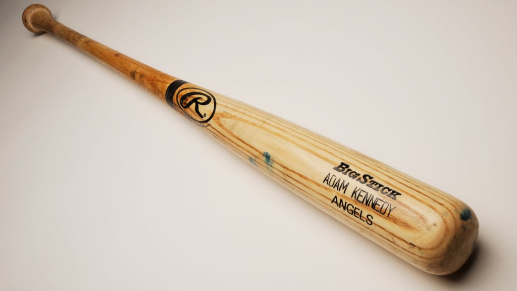 Fun facts: Adam Kennedy, who finished his 14-year Major League career with 80 home runs in 6,055 plate appearances, muscled up in Game 5 of the 2002 AL Championship Series. He used this bat to mash three home runs in consecutive at-bats to seal a 13-5 triumph over the Twins that sent the Angels to the World Series.