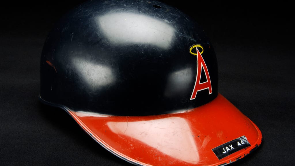 Fun facts: Reggie Jackson wore this batting helmet as he joined the select 500-home run club with a drive to right field in Anaheim on Sept. 17, 1984. Coincidentally, Jackson hit his first Major League home run at the same ballpark 17 years earlier as a rookie with the Kansas City A’s.