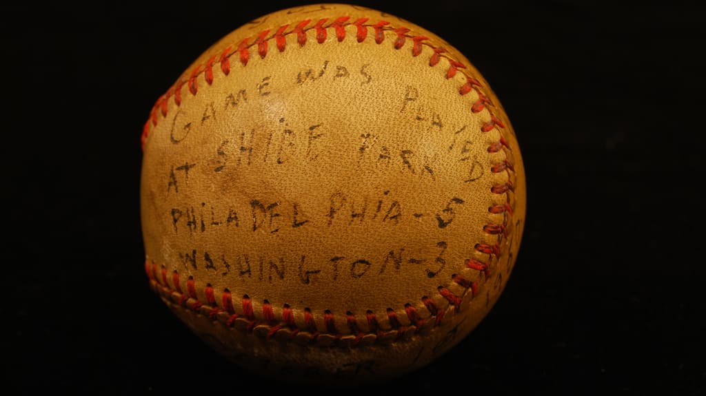 Fun facts: This baseball was a memento from Mack’s last managerial victory, recorded on Oct. 1, 1950, in his half-century at the helm of the A’s. He was 87 when he stepped down, having guided his teams to 3,731 wins.