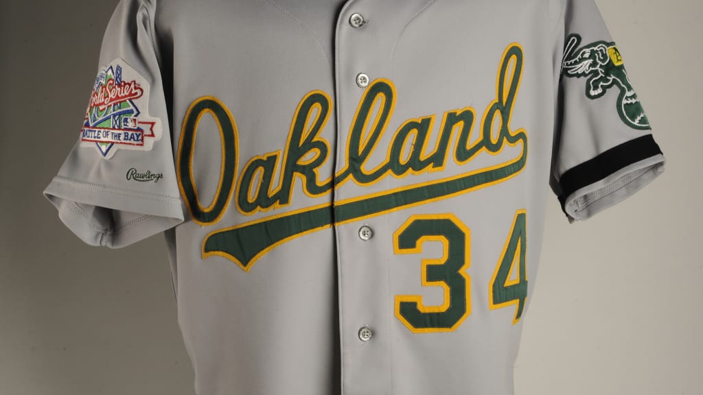 Fun facts: It wasn’t enough for Dave Stewart to blank the Giants, 5-0, in Game 1 of the 1989 World Series. Wearing this jersey, Stewart returned to start Game 3, which ended the 10-day interruption forced by the Loma Prieta earthquake. He earned the decision in Oakland’s 13-7 victory on his way to winning Series MVP honors.