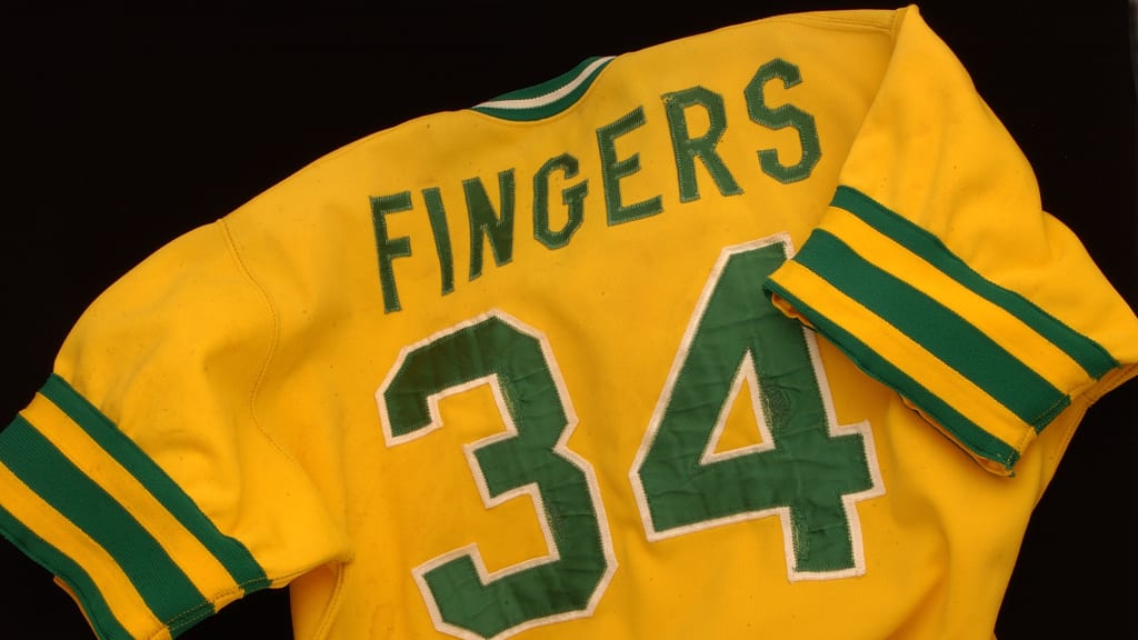 Fun facts: Of the 19 games Oakland played while winning three consecutive World Series (1972-74), Fingers appeared in 16 of them, reflecting his importance to the club. The relief ace wore this jersey in Game 5 of the ’74 Fall Classic against the Dodgers, whom he blanked for the final two innings in Oakland’s Series-clinching 3-2 win.