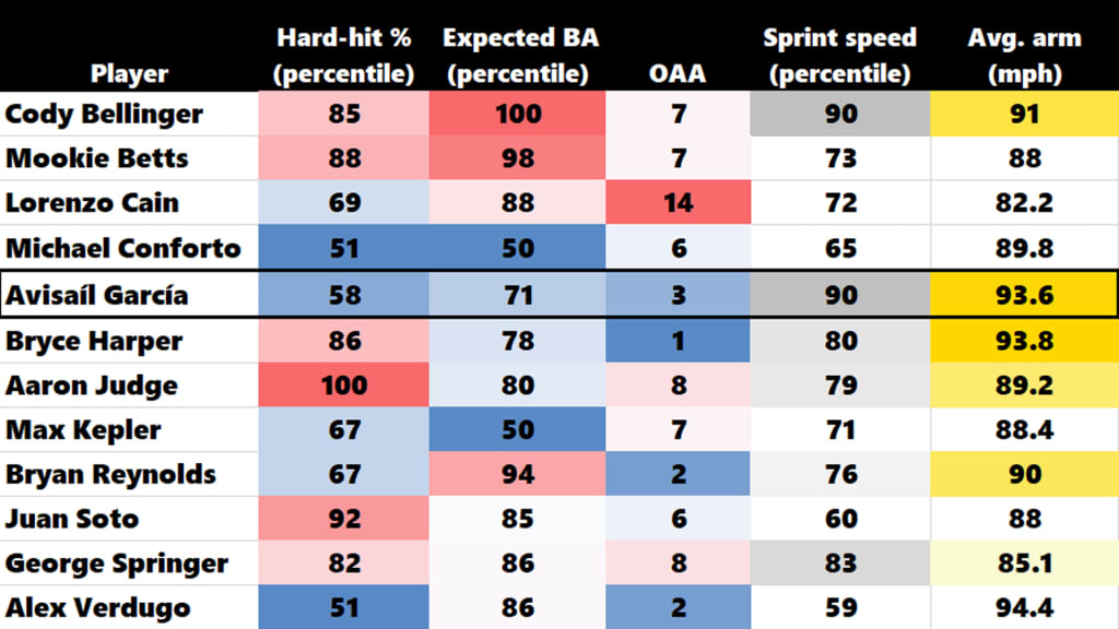 The pool of outfielders with that many tools might be smaller than you think. Start with hitting and fielding; only 12 outfielders, including García, placed in the 50th percentile or higher in hard-hit rate and xBA (min. 250 PA), while also finishing with a positive OAA rating. As you'll see below, just about all of them are big names. Tack on an average sprint speed in the 75th percentile or higher, and the group winnows down to six (marked in silver), including García. And Harper was the only member of that sextet with a higher average arm strength.