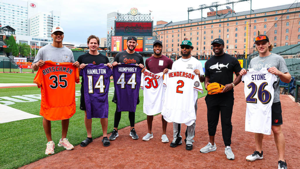 Humphrey and Rodriguez swapped signed jerseys on the field pregame, when they were joined by Hamilton, safety Geno Stone and linebacker Roquan Smith of the Ravens and catcher Adley Rutschman and infielder Gunnar Henderson of the O’s. Hamilton and Rutschman also completed a jersey exchange, as did Stone and Henderson.