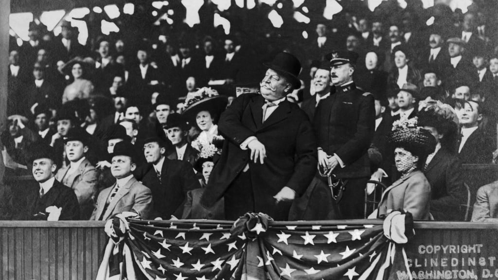 The very first Congressional Baseball Game was played there in 1909 -- the Democrats crushed the Republicans, 26-16. The Georgetown Hoyas once won a football game there 96-0. And one of baseball's grandest traditions began on the hallowed D.C. grounds back on April 14, 1910: William Howard Taft delivered the very first Presidential First Pitch. Look at that form, look at that watchful crowd. A no-doubt laser to Walter Johnson.
