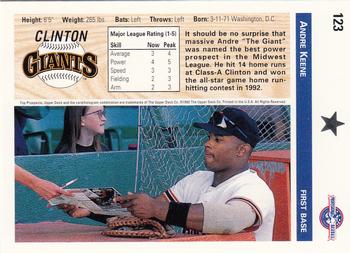 The Maryland native was drafted by the Giants in 1990 and dominated the low Minors with speed, power and his adept ability to get on base. At one point, he was the No. 6 prospect in the Giants' system. He led his teams in walks, RBIs and homers on multiple occasions. He became known as Andre the Giant, winning home run derbies by blasting balls through outfield Pepsi signs.