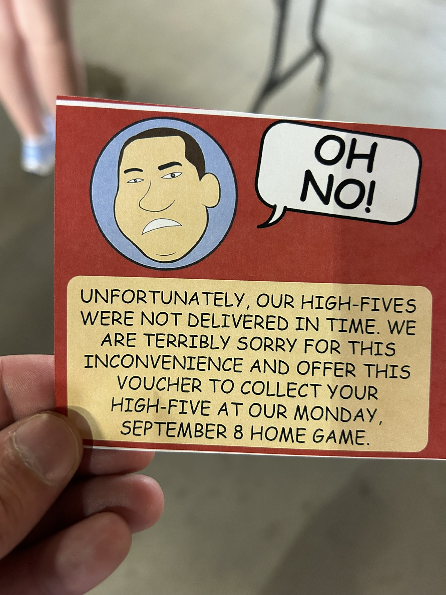 "You can expect awful graphics, awful music and awful on-field [between-inning contests]," Kessling continued. "We had Hot Dog Boy out on the party deck, and I do want to pass this along from the front office: We do apologize that our high-fives did not come in tonight, and hopefully you got one of those vouchers if you’re one of the first 500 fans."