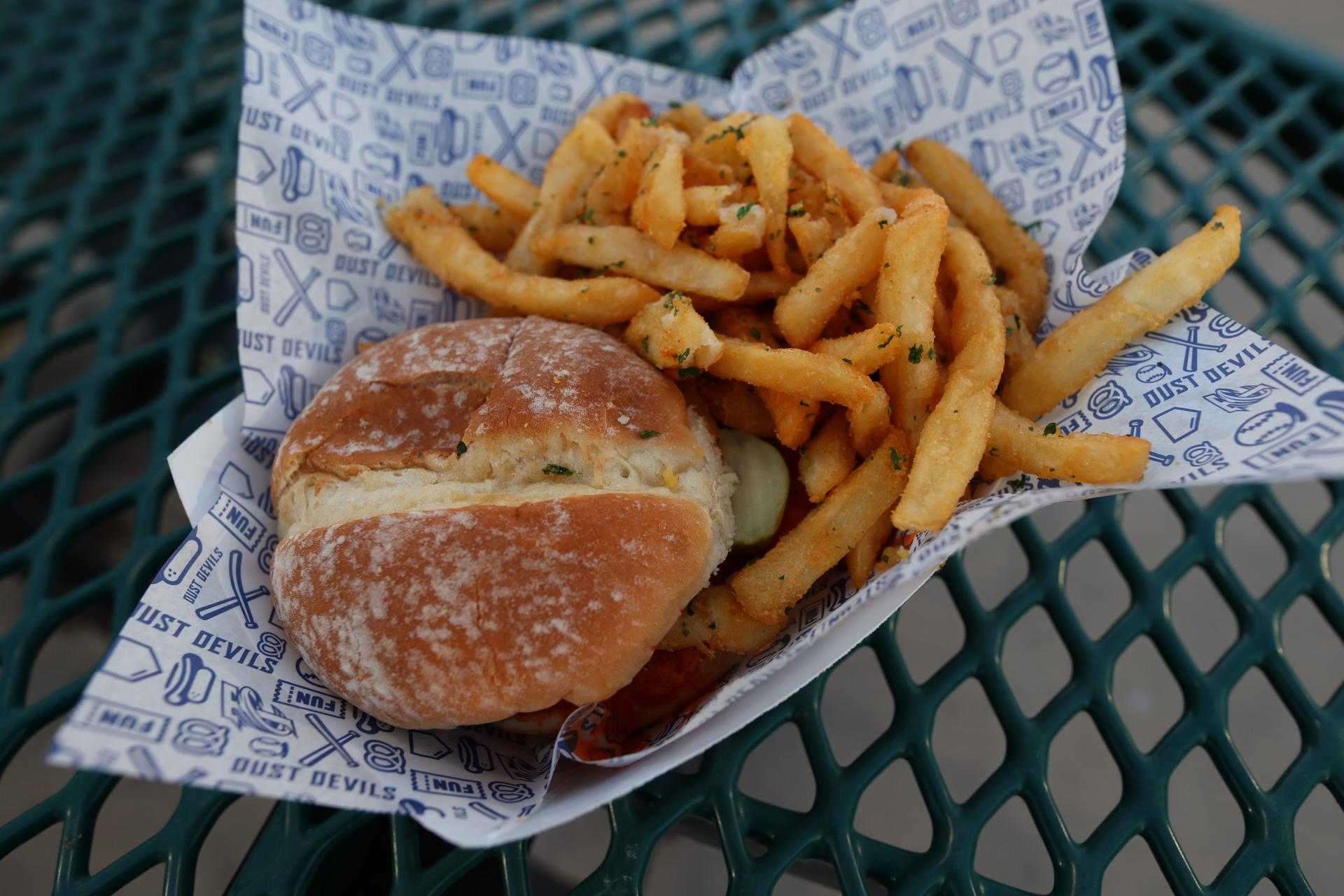 Mark wore his vintage Tri-City Atoms jersey to the game, a fitting choice considering his professional background and his ballpark meal. This is the incandescent Atomic Clucker chicken sandwich, served with garlic parmesan fries.