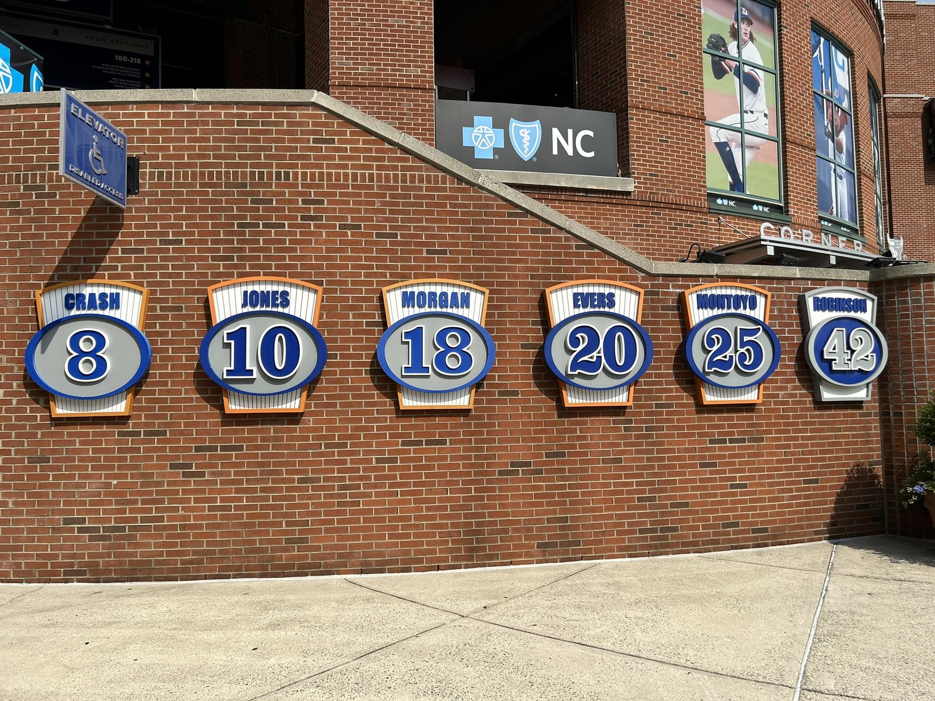 The retired numbers posted on a wall outside the ballpark illustrate the Bulls’ long history.