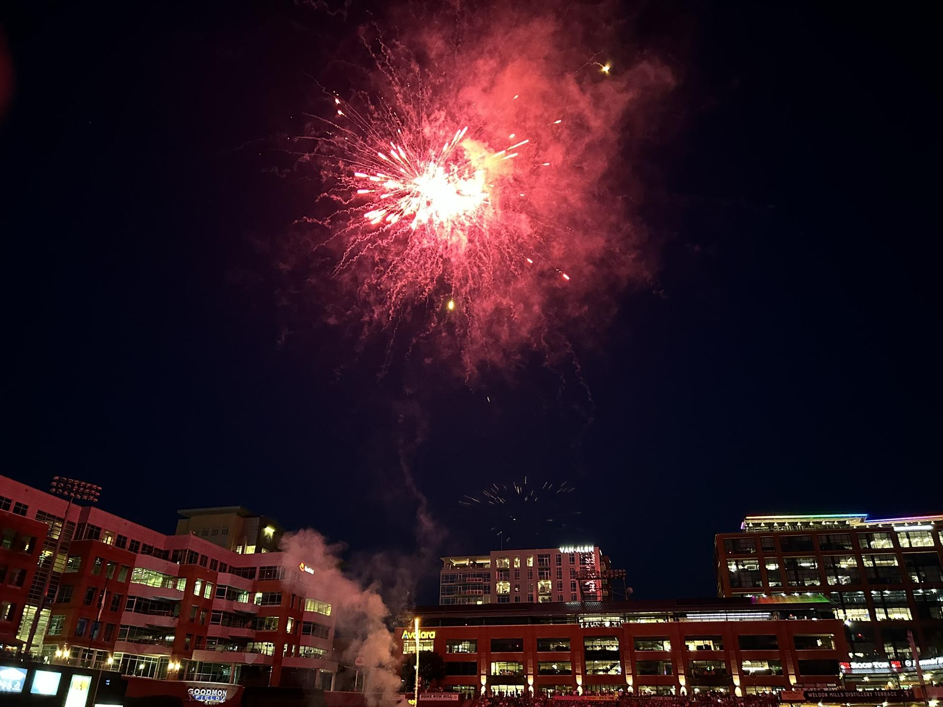 During the waning moments of the game I interviewed longtime Bulls president Mike Birling about his career, and afterwards he and I went into the home dugout to watch the fireworks. The addition of new apartments and office buildings beyond the outfield has made it so that the fireworks are now shot from the field.