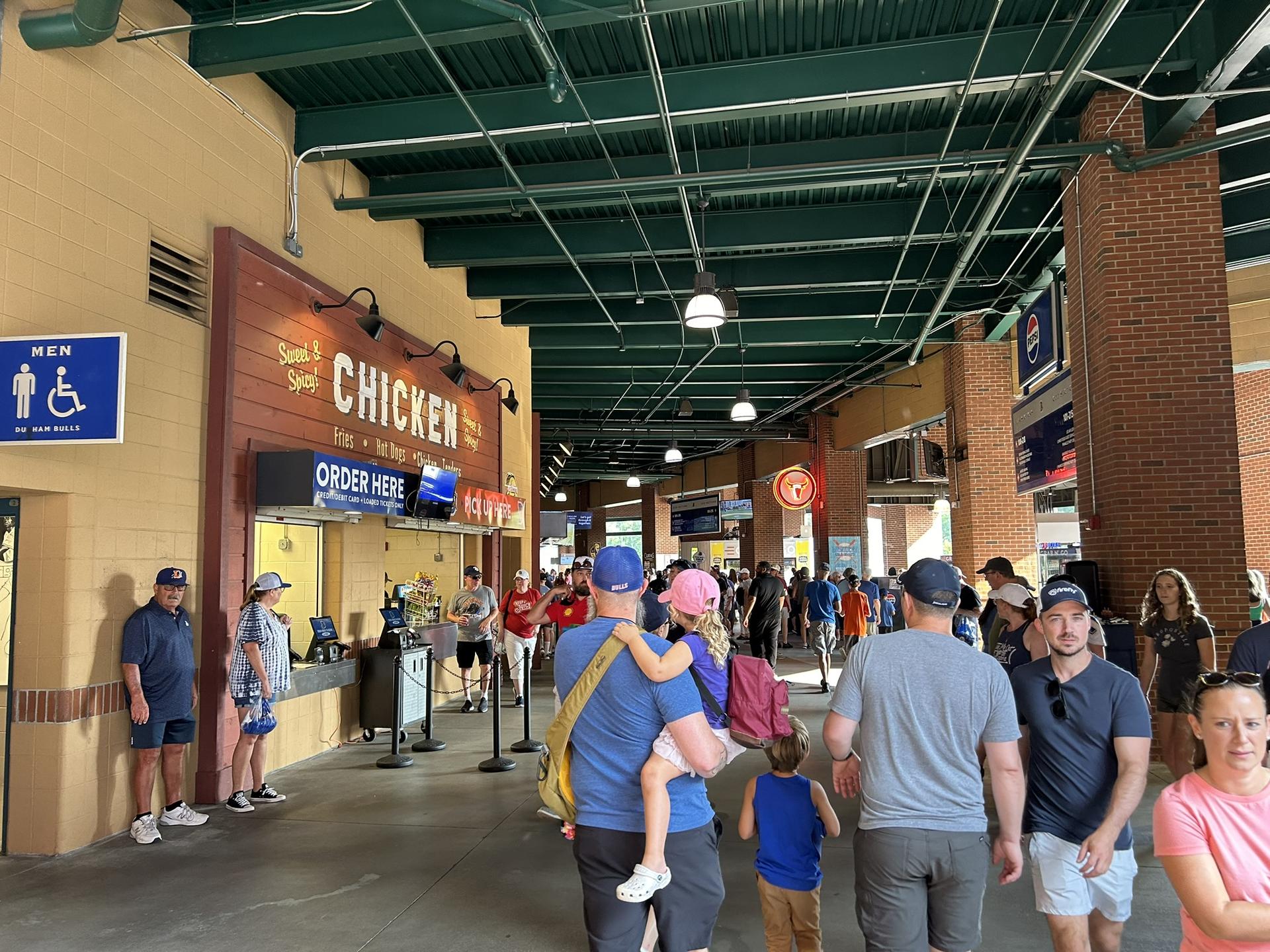 Recent renovations, largely geared toward meeting player development-related facility standards, have resulted in a reconfigured ground floor. The entrance leads into a “History Hallway,” which faces the player’s weight room (visible through glass). Fans can also glimpse Bulls players in the batting cage via windows on the outside of the ballpark.