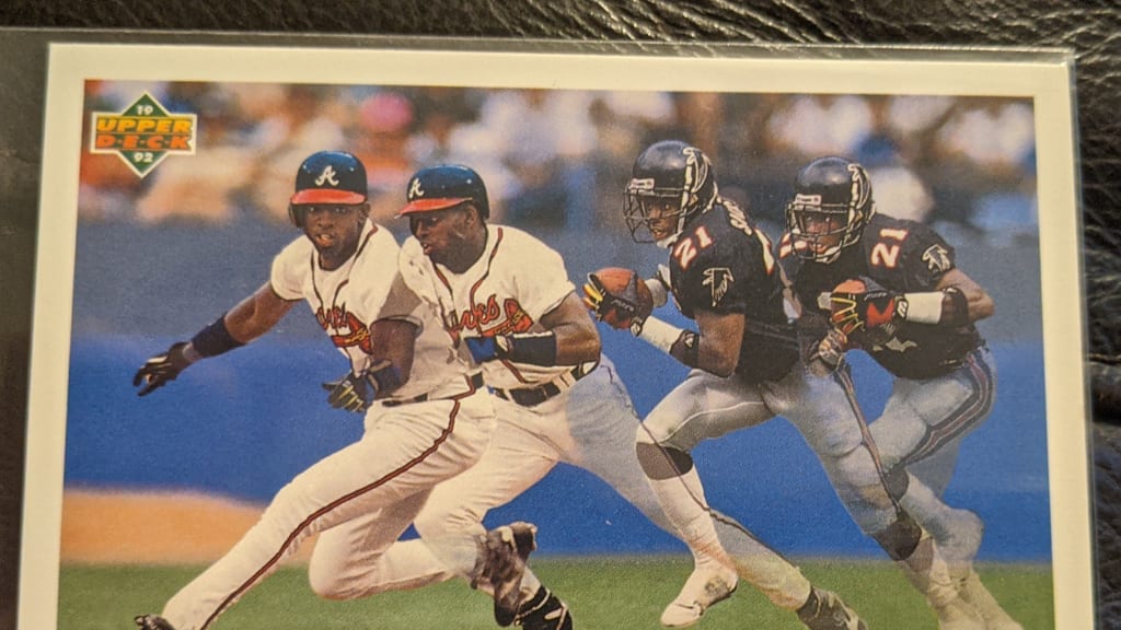 Wow. Look at this beauty. They don’t get much more creative than this -- a card featuring “Prime Time” in his element -- morphing from a defensive back for the Atlanta Falcons into a center fielder for the Braves as he takes his lead from first base.