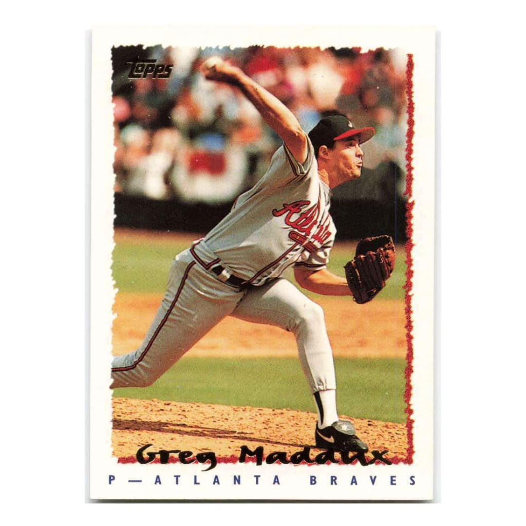 Topps chose a nice picture for Maddux's 1995 card, too, capturing the right-hander just as his arm begins to whip forward mid-pitch, a look of concentration on his face.