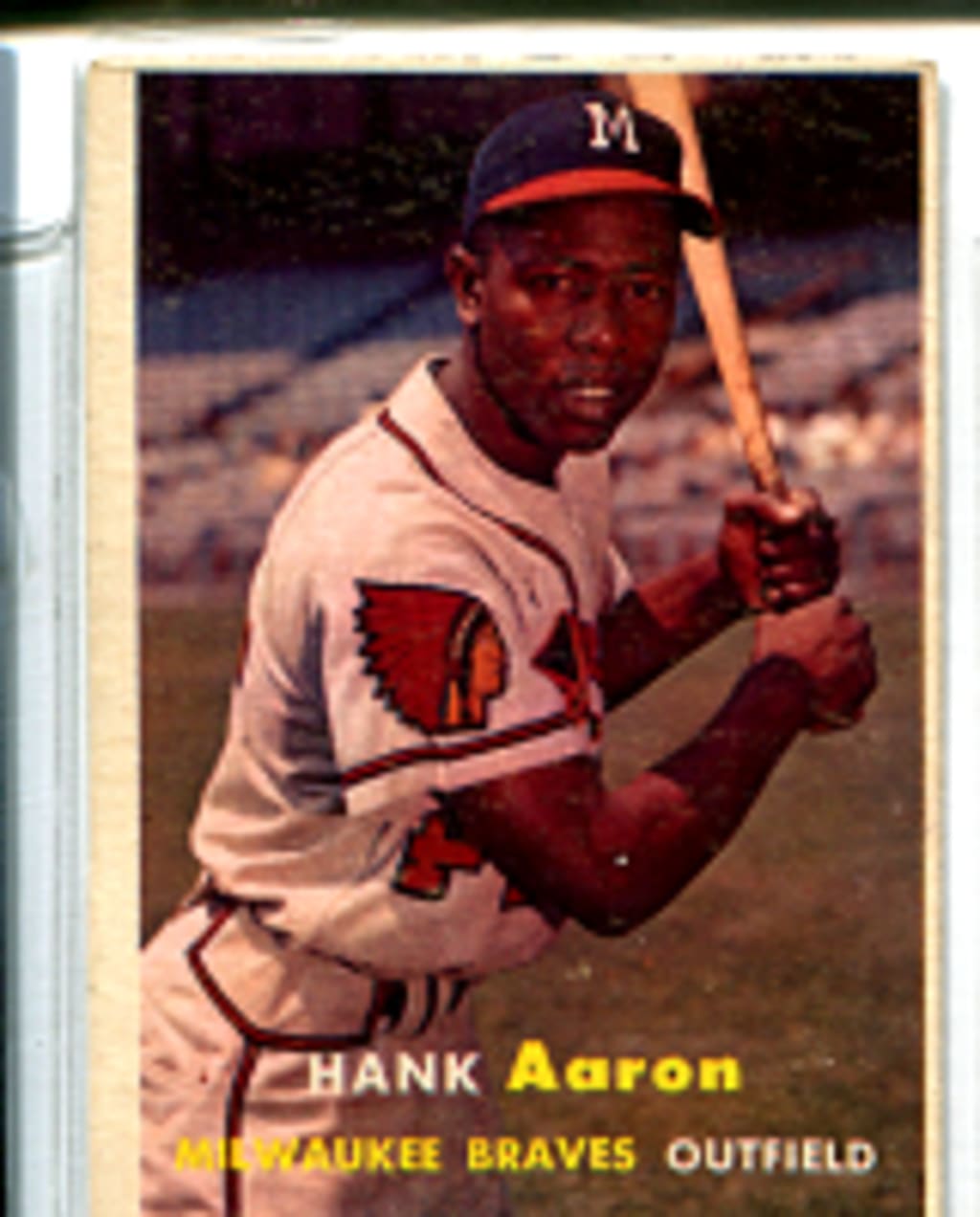 Another great element to this card is that it's from 1957, the only year the Milwaukee Braves won the World Series, and the only time Aaron won it all -- though he helped lead the club back in a rematch against the Yankees the following year.