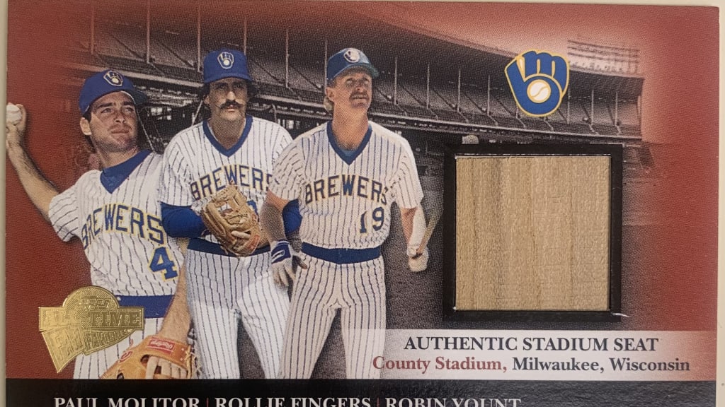 In 2003, Topps produced a beautiful “Best Seat in the House” set, which featured a piece of a seat from select ballparks and photos of some of the greatest players in a franchise’s history on the front next to the relic. In the case of the Brewers and County Stadium in Milwaukee, the three were Hall of Famers Yount, Molitor and Fingers.