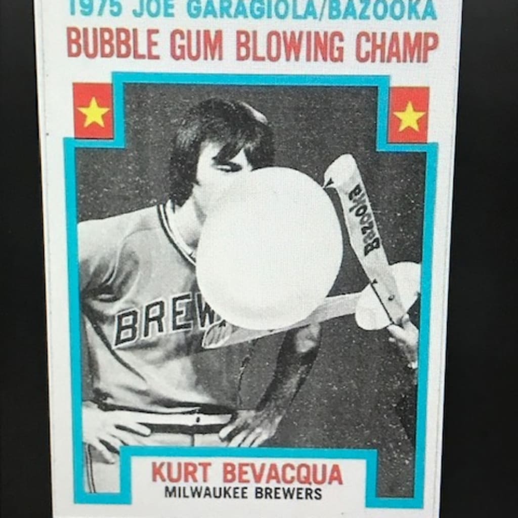 That's what Brewers infielder Kurt Bevacqua is seen doing on a 1976 Topps card depicting his victory in the '75 Joe Garagiola/Bazooka Big League Bubble Gum Blowing Championship on Aug. 4 of that year.