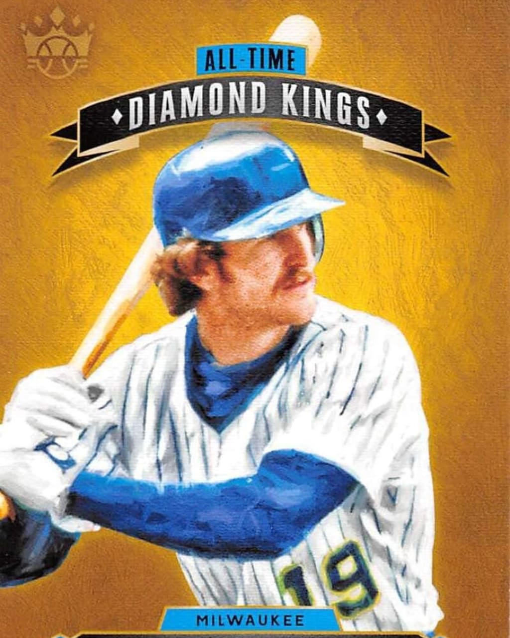 Here we have a painting of one of the greatest Brewers of them all in his batting stance, surrounded by the majestic and artistic flair Diamond Kings has always been known for. Truly a classic player on a card with classic style. -- Manny Randhawa
