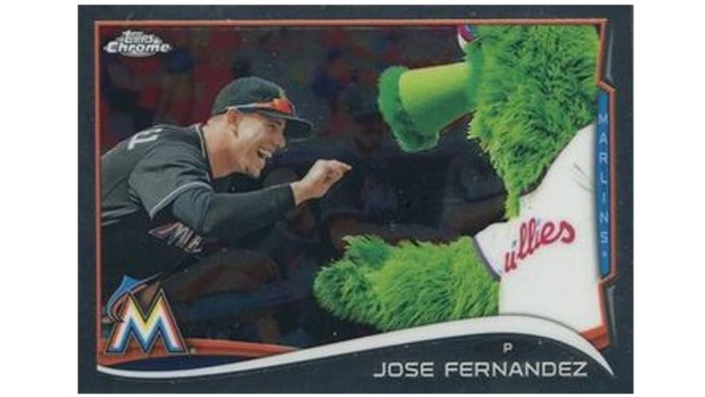 The card shows Fernández having a fun moment with the Phillie Phanatic, a broad smile on his face. This wasn't the only time the two interacted, of course, as they ended up starting a friendly rivalry. Their most memorable confrontation came in '16, when the Phanatic pretended to arrest Fernández after the pitcher jokingly swiped the keys to the mascot's ATV. -- Thomas Harrigan