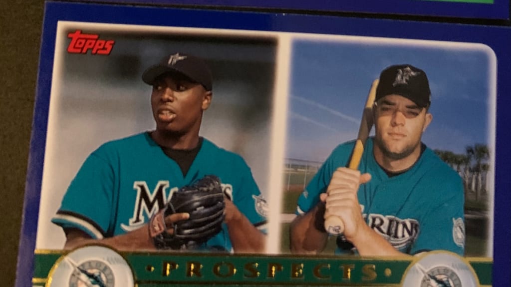 The two appeared together on a prospect card in Topps’ 03 set, both wearing classic Marlins teal. It was submitted via our survey by Cleveland’s Brett Shaver.