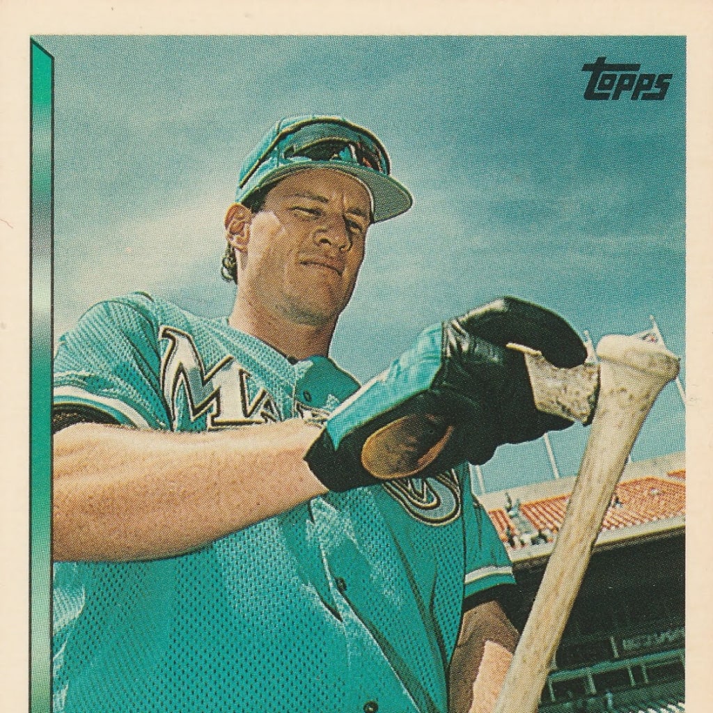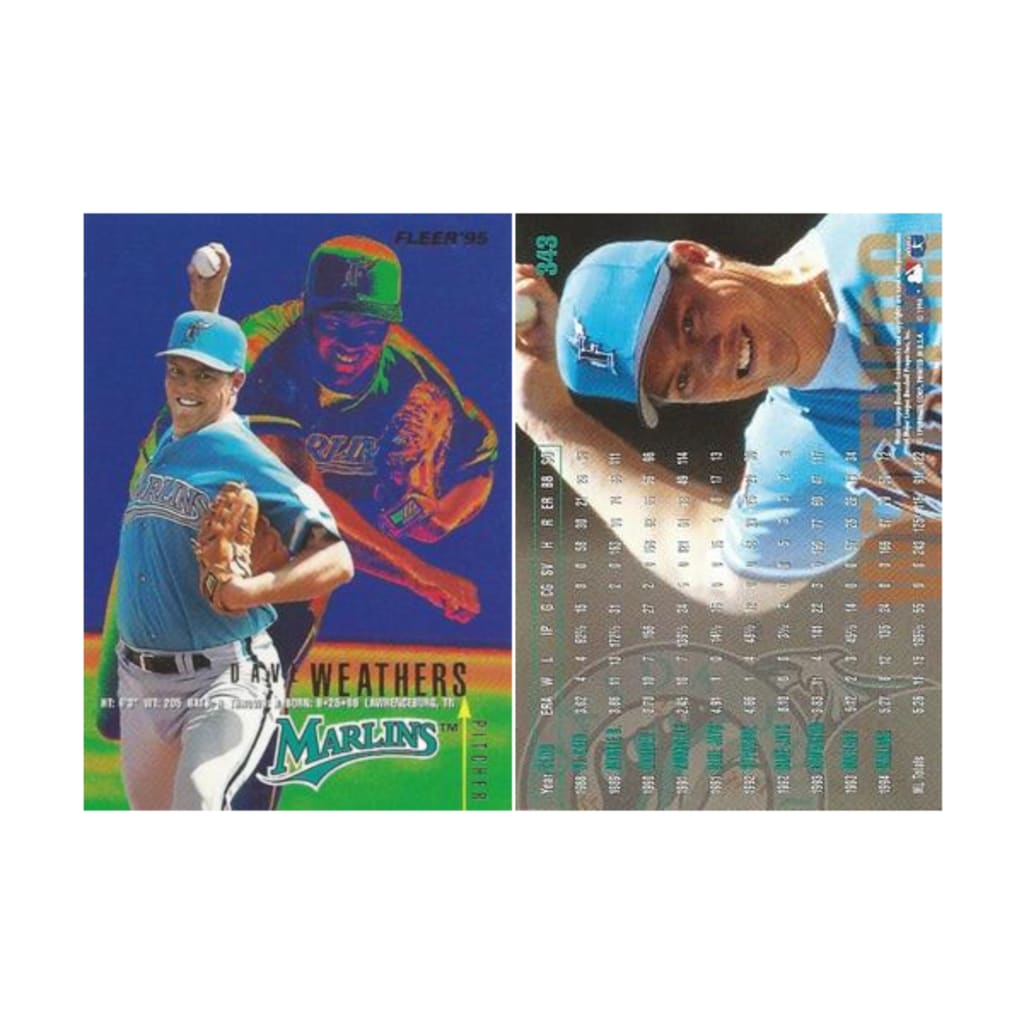 The color scheme of Weathers' 1995 Fleer card is … loud. But that's what makes it unique. The neon greens and oranges in the background photo, coupled with the aquatic blue Florida Marlins uniform the right-hander is wearing in the foreground photo, makes for an eye-popping combo.