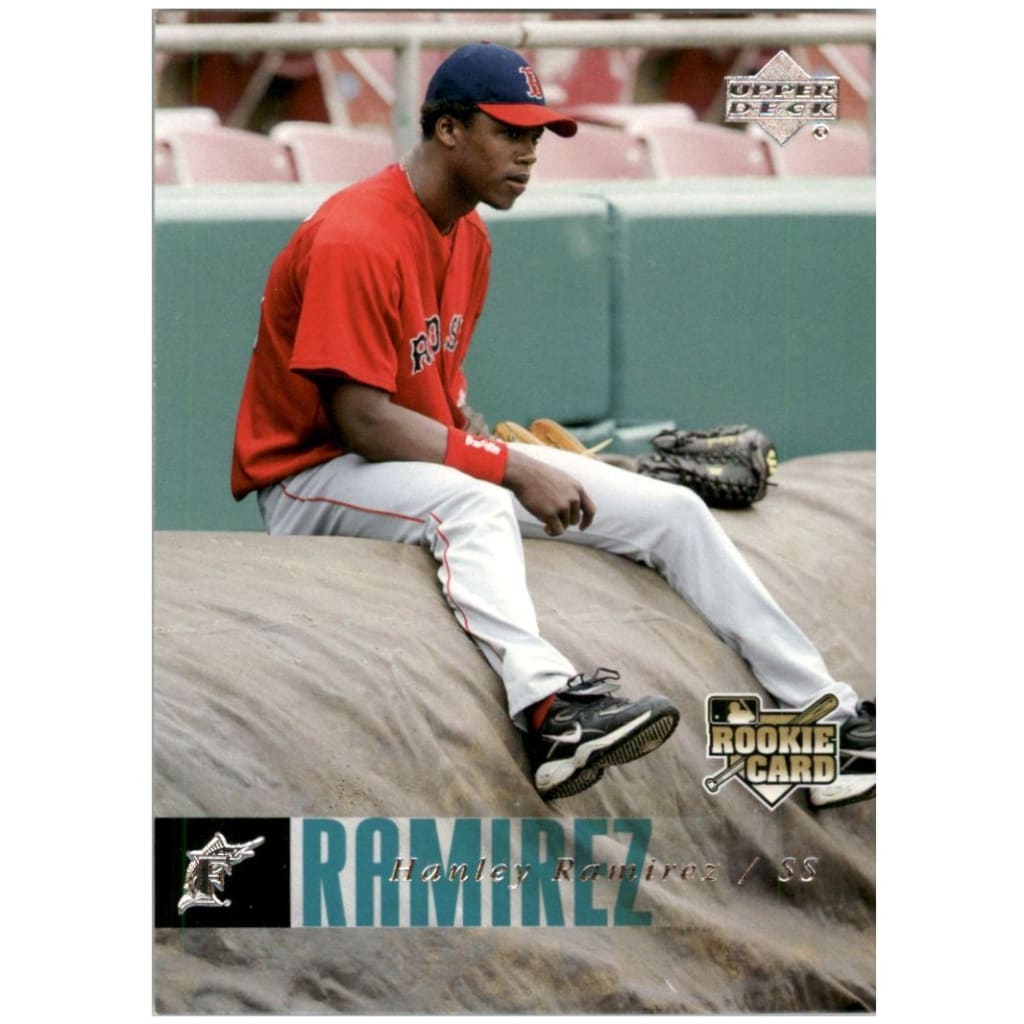 Ramirez was traded from the Red Sox to the Marlins in a seven-player deal that sent Josh Beckett, Mike Lowell and Guillermo Mota to Boston in November ‘05, and Upper Deck evidently did not have time to procure another photo. So the company ran with the image of Ramirez in a Red Sox uniform and slapped a Marlins logo on the card. The candid shot depicts the young shortstop chilling out on the tarp with his glove nearby.