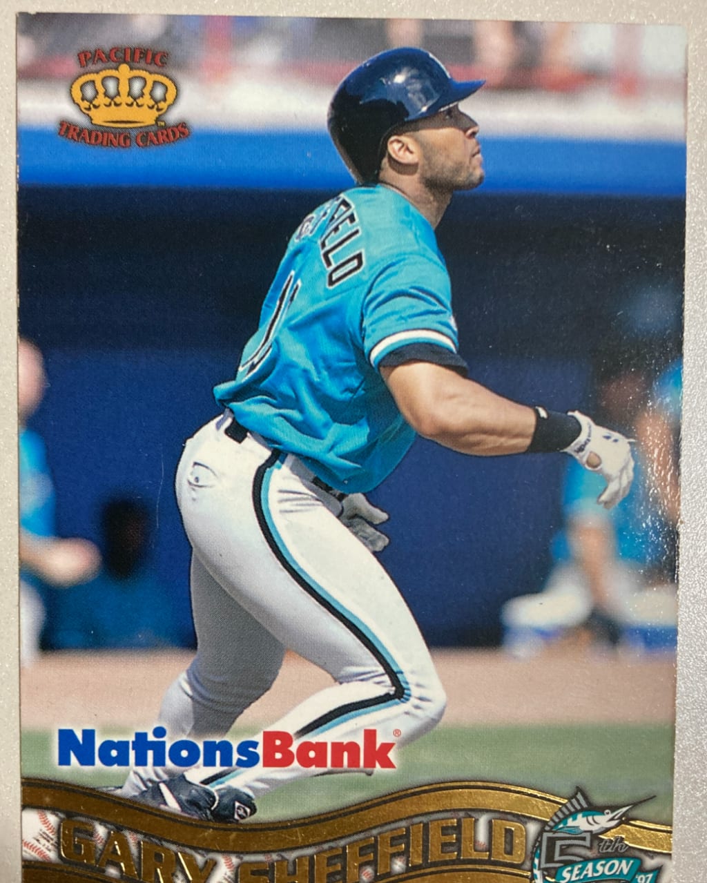 Danny submitted this great card of one of the key sluggers on that club, Gary Sheffield. The card itself is awesome in that it goes with the “5th season” of the franchise on the front, with a shot of Sheffield in those sweet solid teal jerseys from the Florida days.