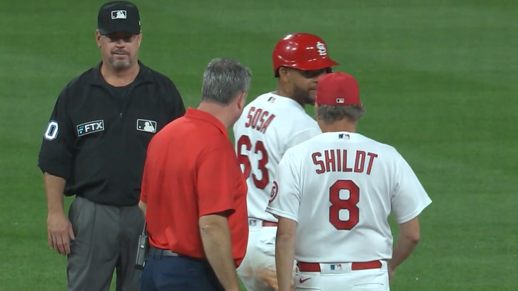 Is it the hilarious look on the umpire's face as the Cardinals trainer and former manager Mike Shildt come out for a peek behind Sosa?