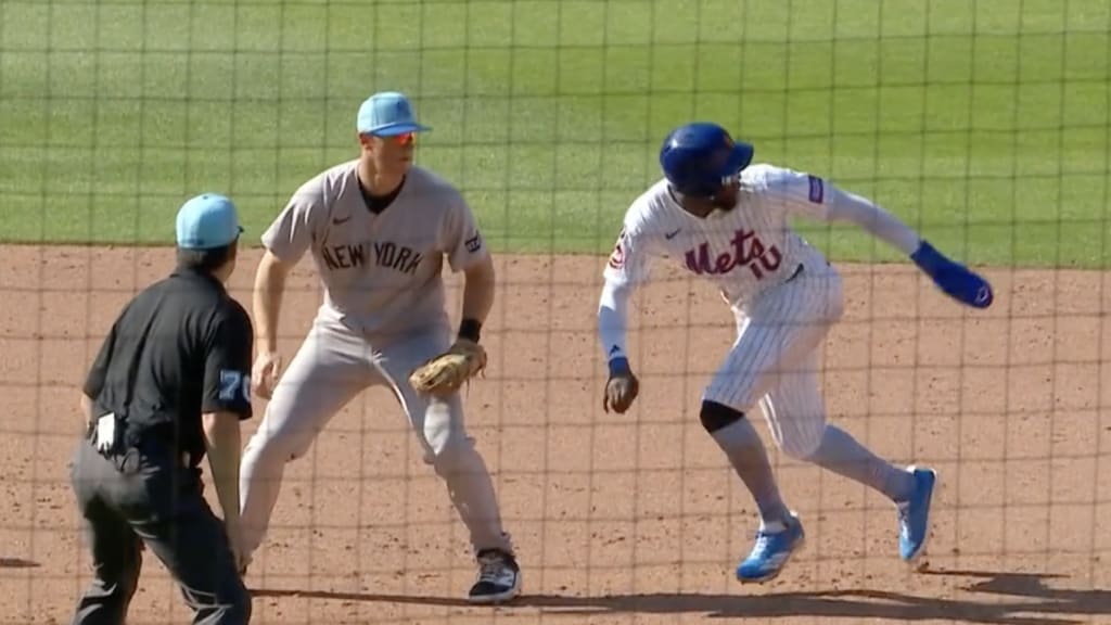 After fielding Brandon Nimmo's grounder, Jazz Chisholm Jr. threw to second hoping to get an inning-ending, 5-4 putout. Instead, his throw was high, forcing second baseman DJ LeMahieu to leap into the air. Mauricio thought the ball got away and got up to race to third base, but he only succeeded in running directly into LeMahieu's glove.