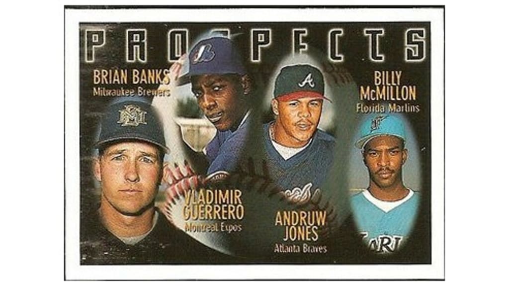 Submitted by Teddy Lockart of Shelbyville, Ill., the card shows Vladimir Guerrero and Andruw Jones among the four prospects. Guerrero and Jones were both a year away from their Major League debuts with the Expos and Braves, respectively.