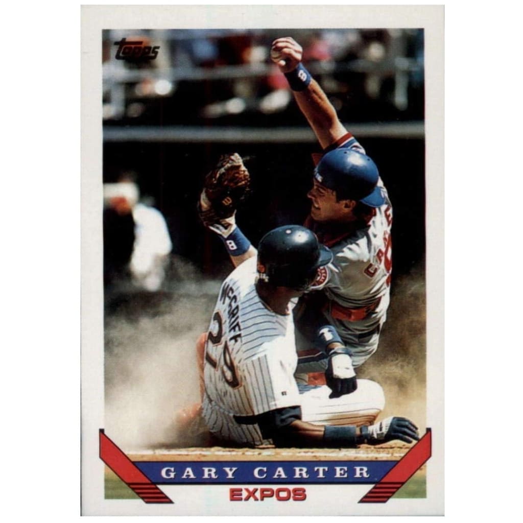 Carter played his final game in 1992, but Topps included him in its ‘93 set, and the card is a doozy. It depicts the veteran catcher holding the ball in the air after blocking a sliding Fred McGriff at home plate as a dirt cloud wafts into the air.