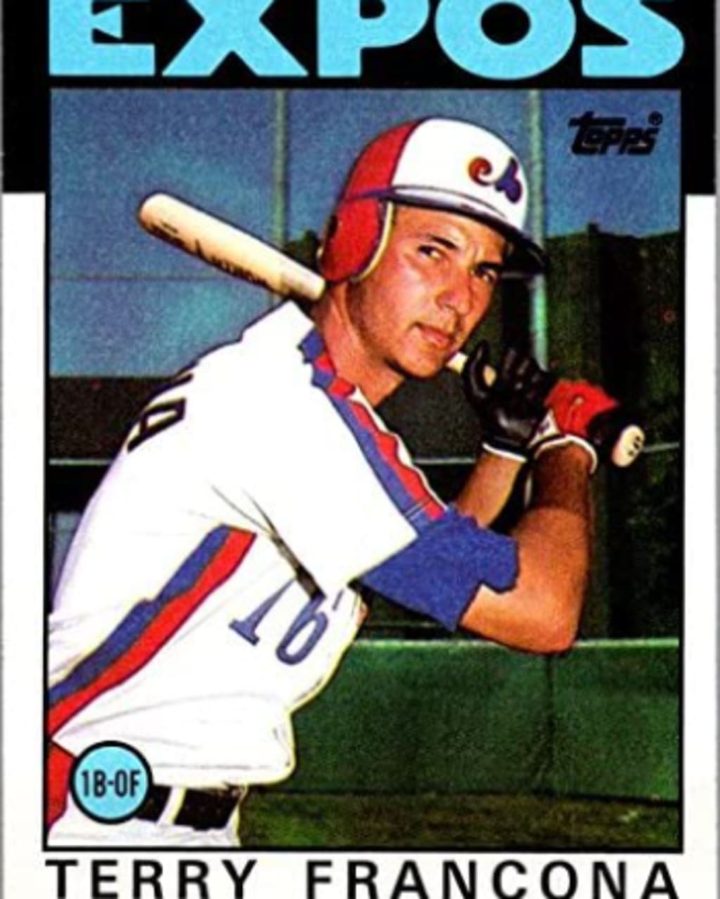 "Terry Francona, Topps 1986 set. A) Because it's Terry Francona on the Expos, which is cool. B) It looks like a toy bat."