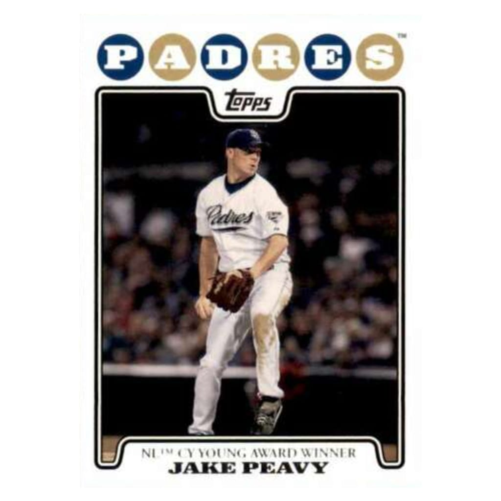 Peavy's '08 Topps card is laid out crisp and clean, with "Padres" in team-colored bubble letters on top, "NL Cy Young Award Winner" in gold on the bottom and Peavy pictured mid-pitch in between.