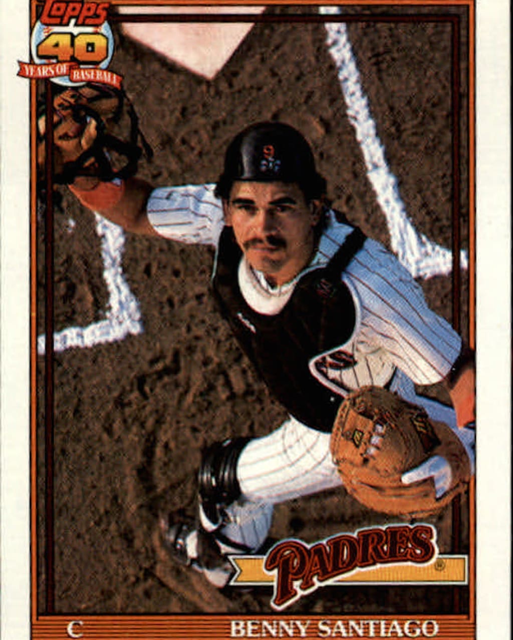 There are very few cards, if any, that give us the tremendous perspective that this 1991 Topps Benito Santiago gives us: the view of the baseball as it comes down into Santiago’s glove on a foul popout.
