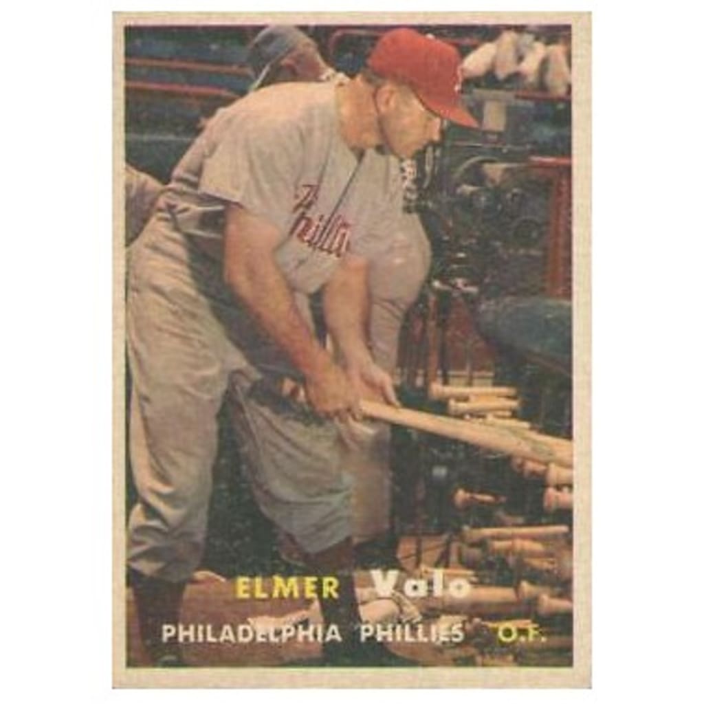 “1950s Topps cards were almost always head and shoulder shots but 1957 Elmo Valo is depicted bent at a bat rack, not even looking at the camera,” Paul wrote. “It was a truly unique pose at the time."