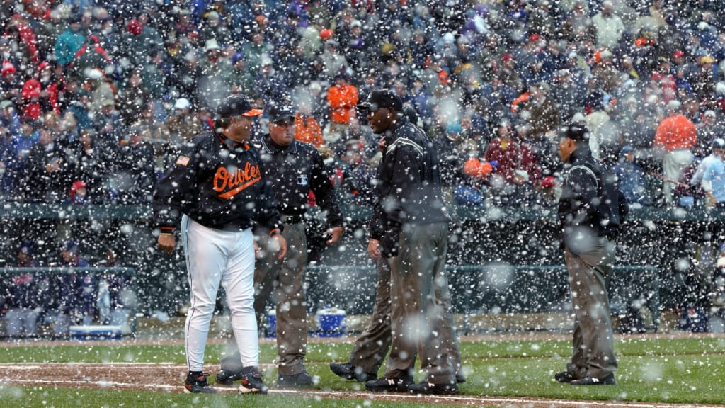 Orioles manager Mike Hargrove looks understandably displeased about having to play through those conditions, and it didn't help that the umpires only delayed the game after the opposing Indians pushed across a run. Things didn't get too heated (get it?) and Hargrove avoided what probably would have been the first "snowjection" in baseball history.
