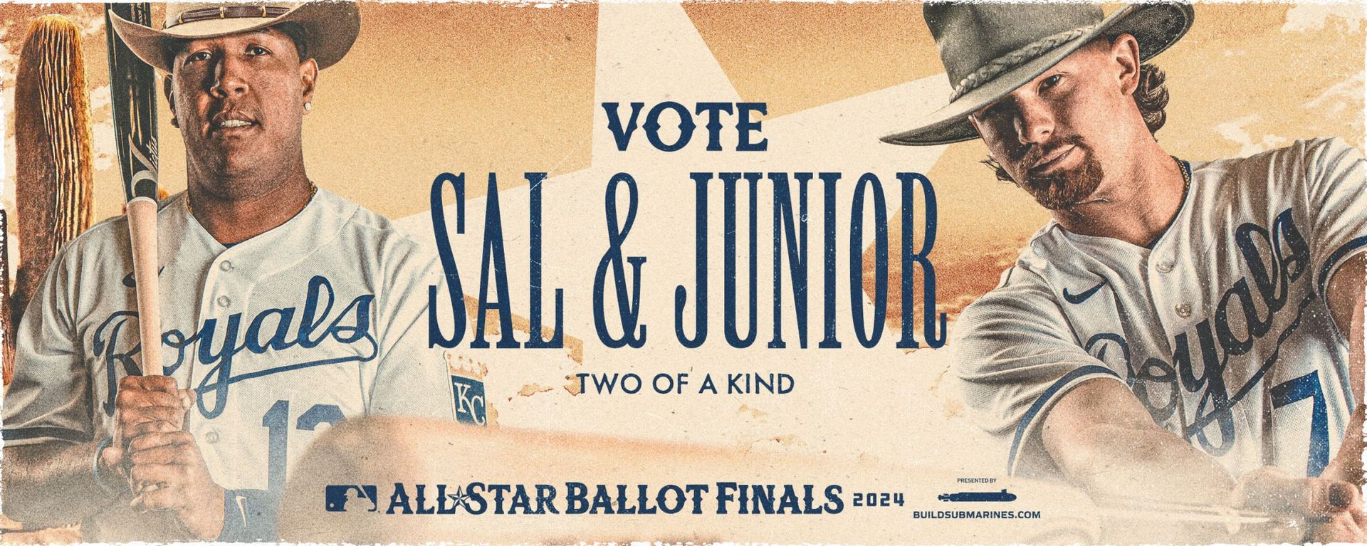 One version of the T-shirt features shortstop Bobby Witt Jr. and catcher Salvador Perez wearing cowboy hats -- a nod to this year’s MLB All-Star Game being in Arlington, home of the Rangers -- and the words “VOTE JUNIOR AND SAL.” Behind them is a pair of King playing cards. Underneath is the phrase “Two of a Kind.”