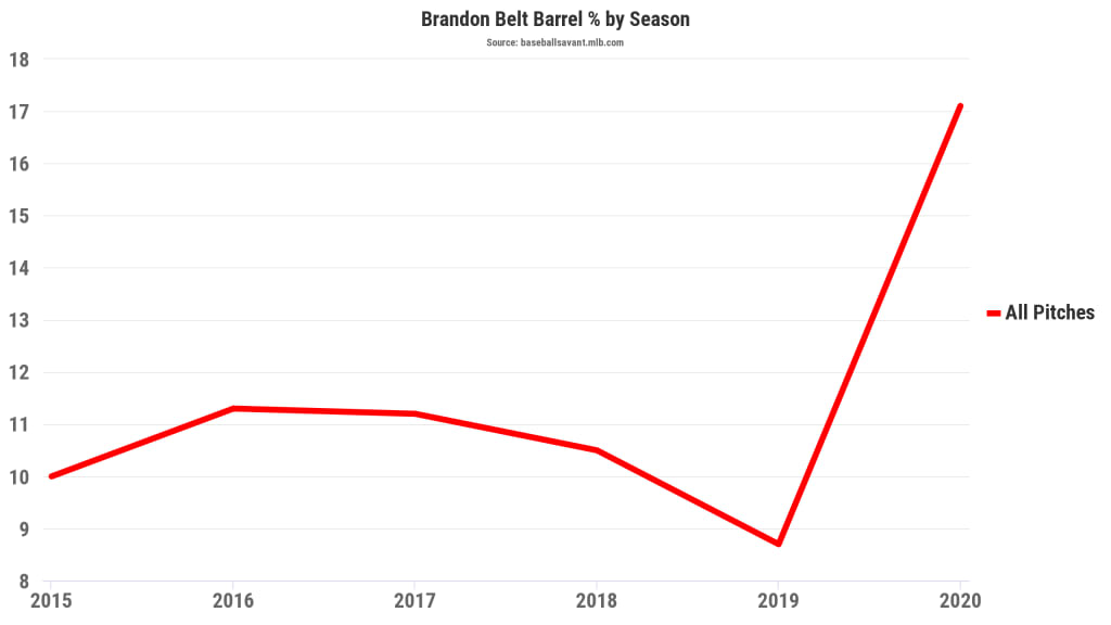 Since then, he’s contributed heavily to an offense that has scored 5.0 runs per game, seventh-most in the Majors. Despite the late start, 2020 has been a whole new ballgame for Belt, and he’s doing something he’s never done to this extent before: crushing the ball.